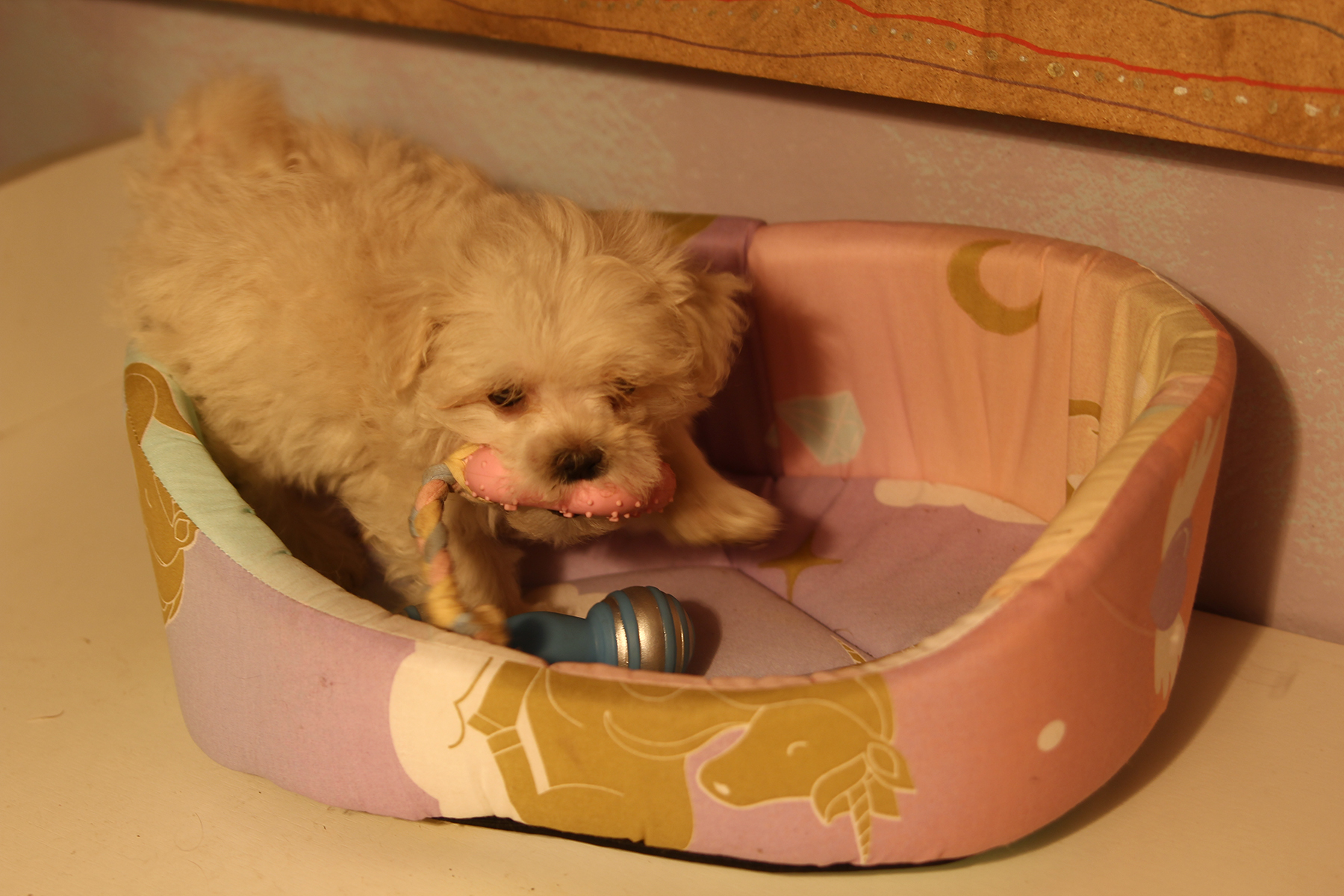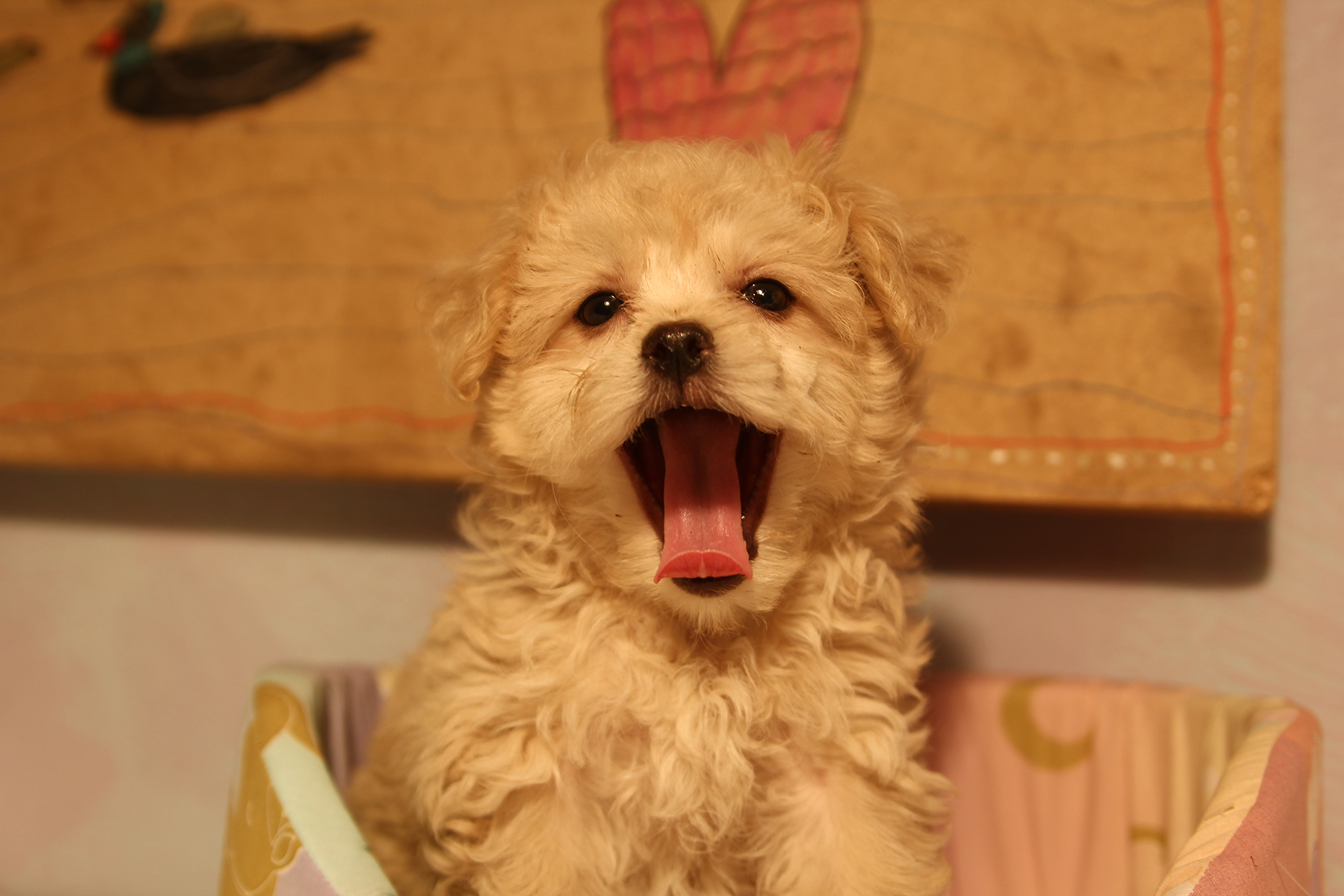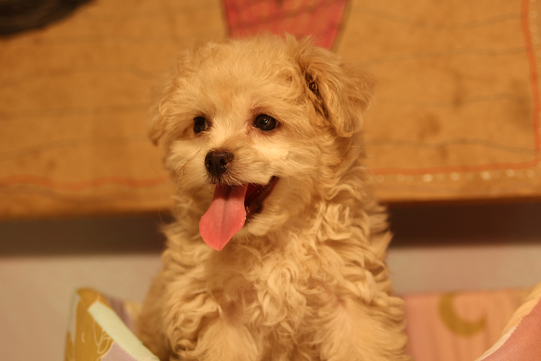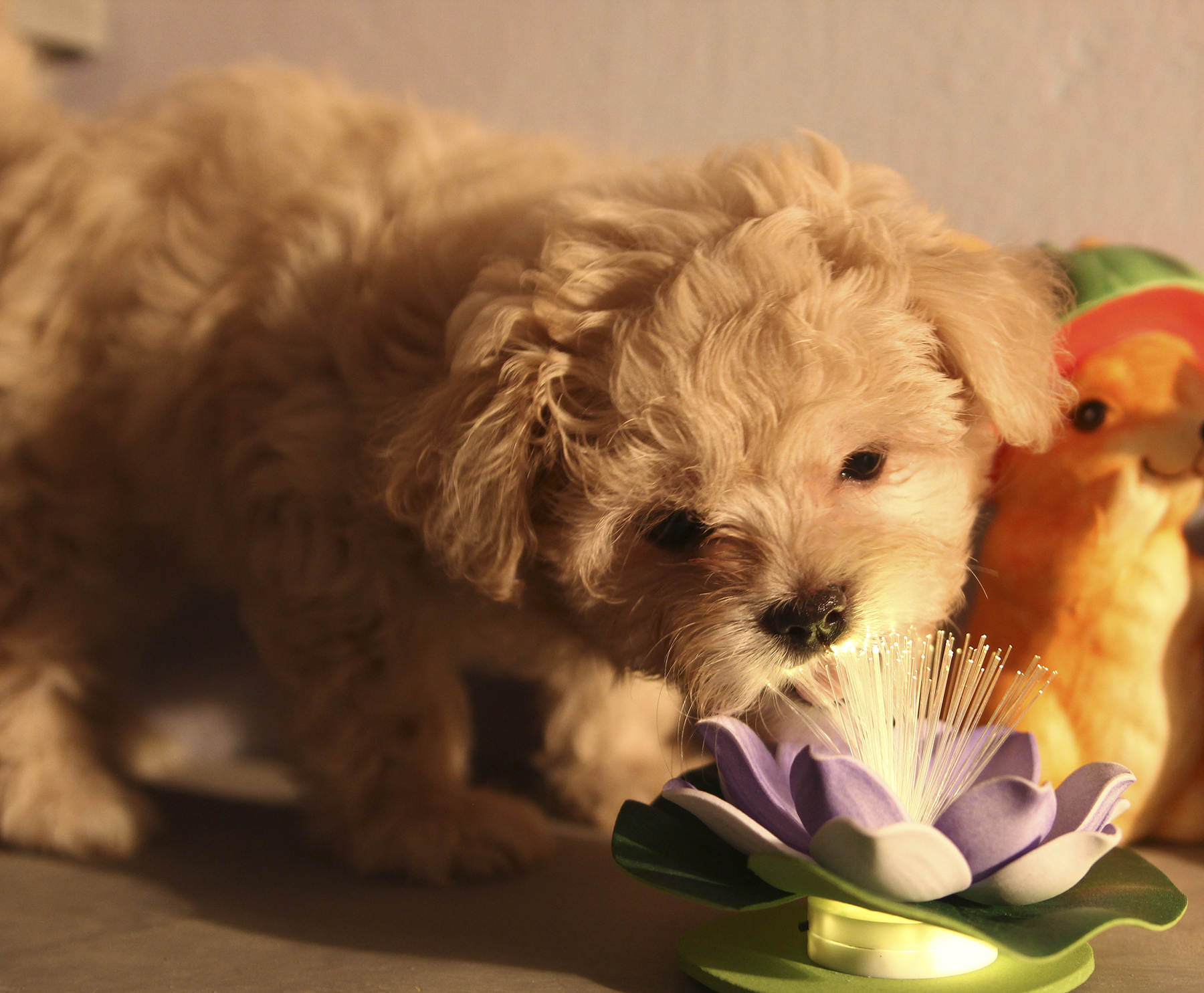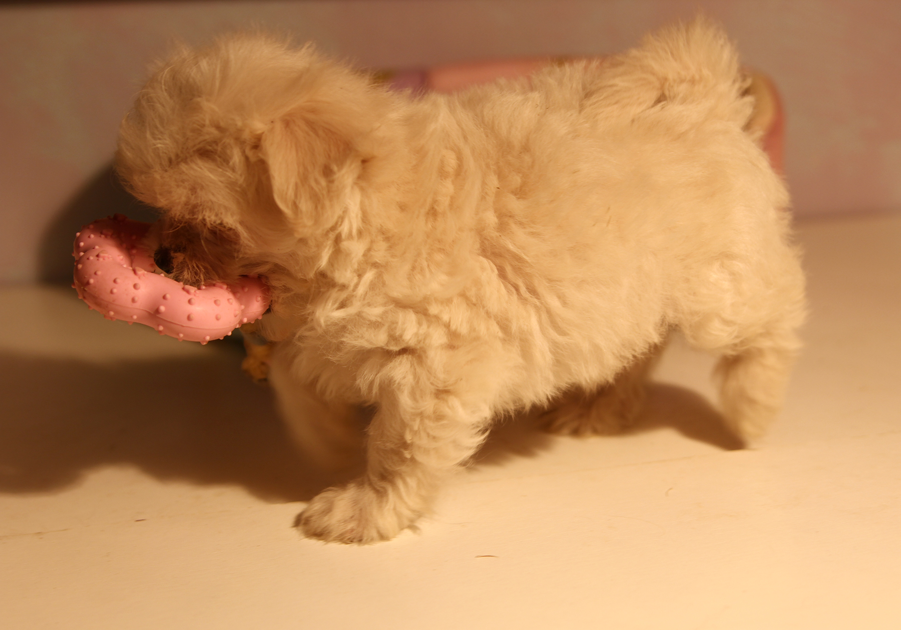 Совершенно золотая, кремовая Злата, ее шерсть - это что-то нереальное, не хочется выпускать ее из рук. И повезло, что она вырастет Стандартом, тоесть около 4кг., чем больше такой пушистости, тем лучше).