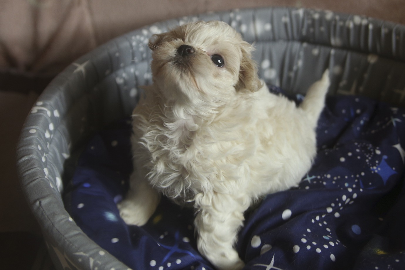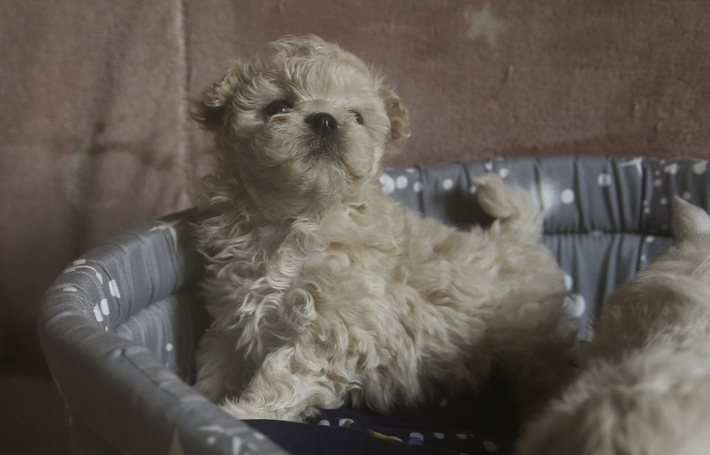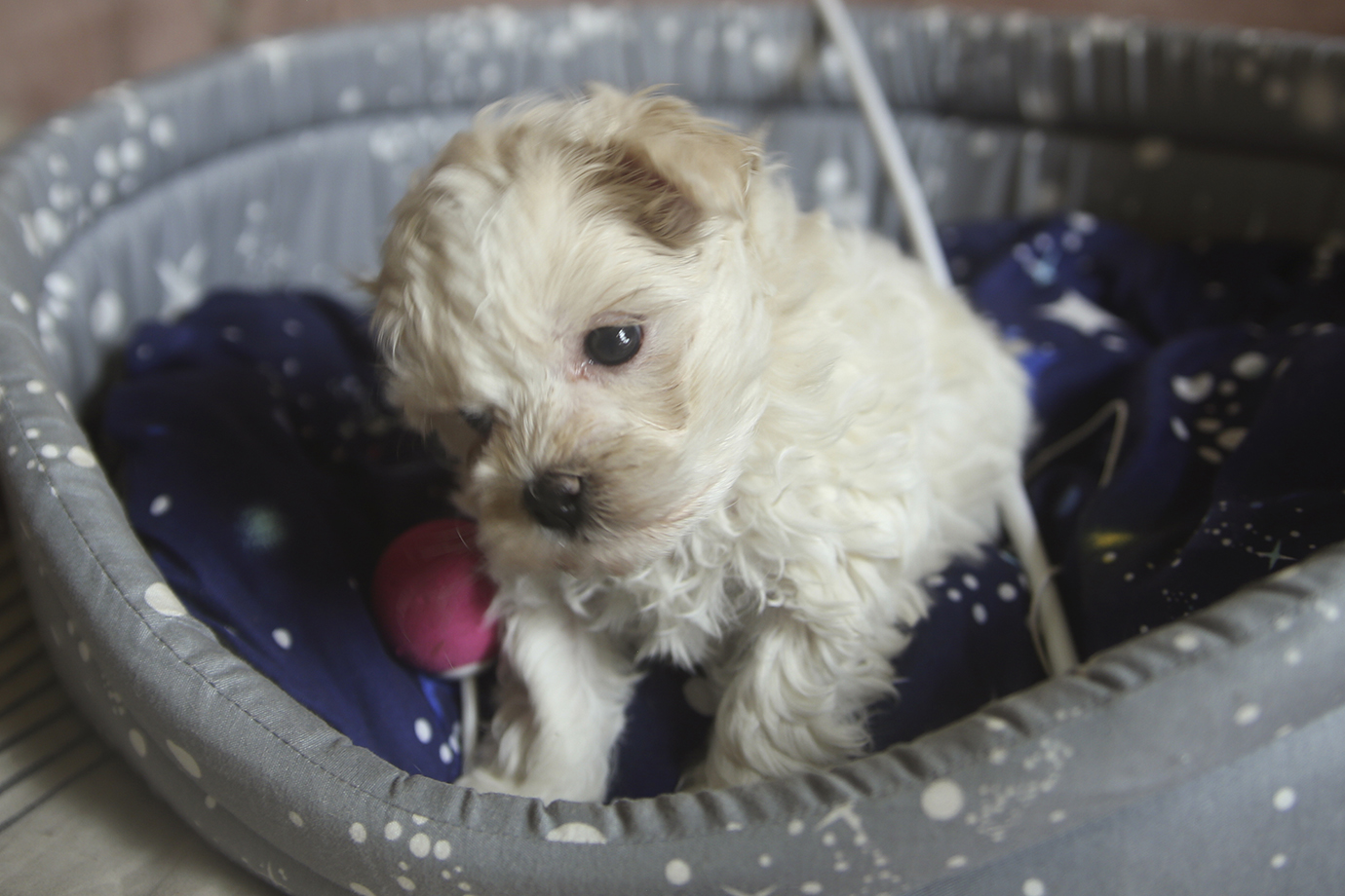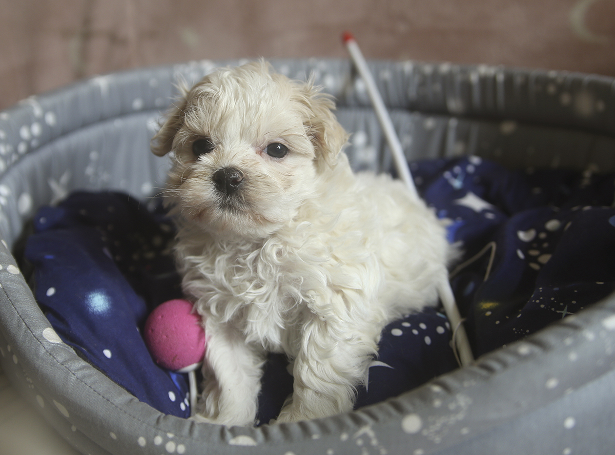 Светло-кремовая кудряшка, сообразительная, самая шустрая и приставучая, очень любит общатся с людьми и играть в догонялки.