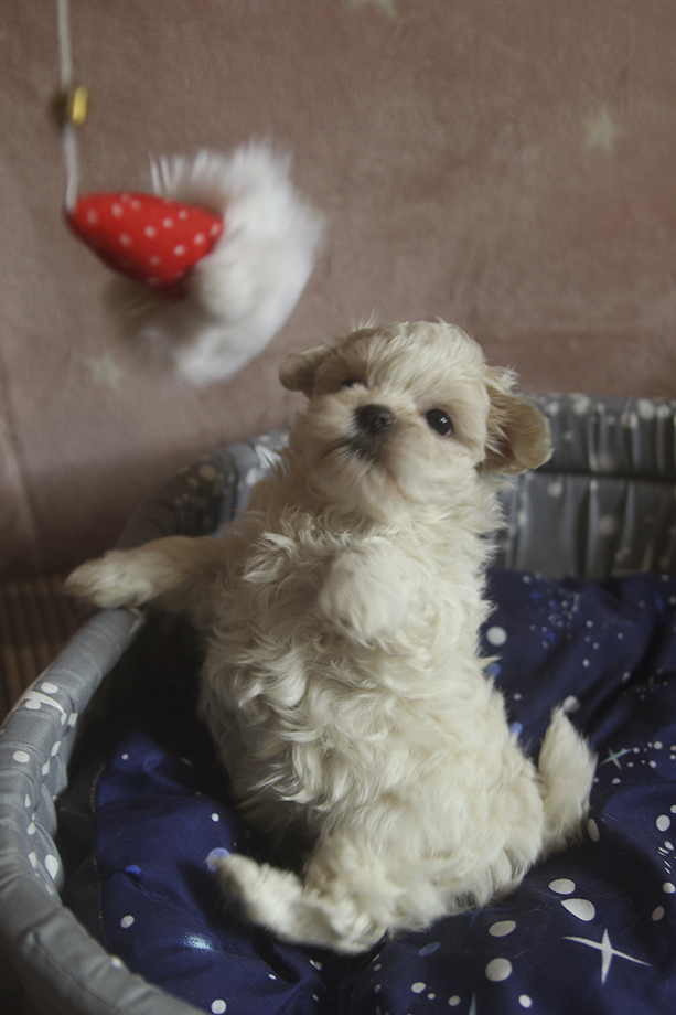 Светло-кремовое чудо. Мальчик миниатюрный, очень любит ласку, общительный, любознательный и игривый, но достаточно спокойный, хорошо обучаемый.