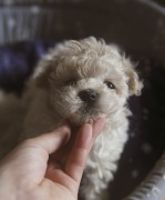 Миниатюрная, кремовая, очень кудрявая девочка, с огромными глазками и аккуратной мордочкой. Вырастет 3-3,5 кг.